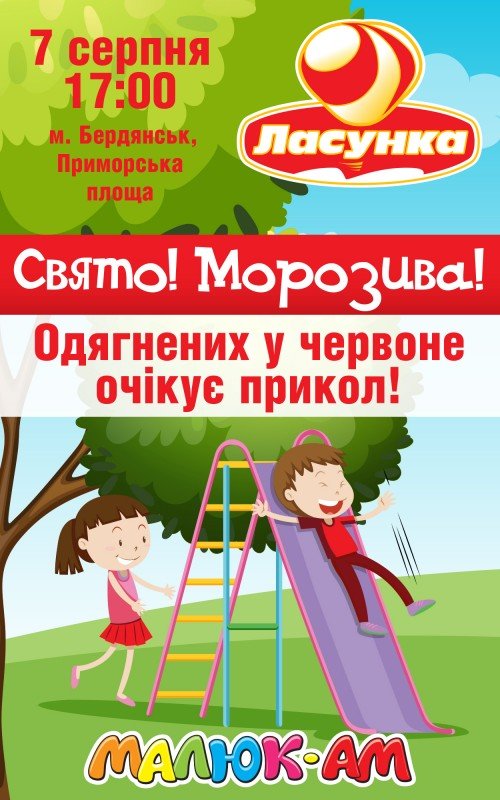 7 августа жителей и гостей Бердянска ТМ «Ласунка» приглашает на организованный им праздник мороженого. Начало в 17:00 очень понравится детям, которых ждет множество развлекательных конкурсов рисунков, гонок на колясках, «Флеш-тату» и другие.
