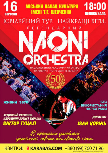 НАОНІ - Національний академічний оркестр народних інструментів України. Колектив успішно гастролює по різних містах і країнах вже протягом 50-ти років. За багато років оркестрантів об'єднала безмірна любов до народної творчості. Їх віртуозне володіння інструментами - яскрава ознака високого професіоналізму.