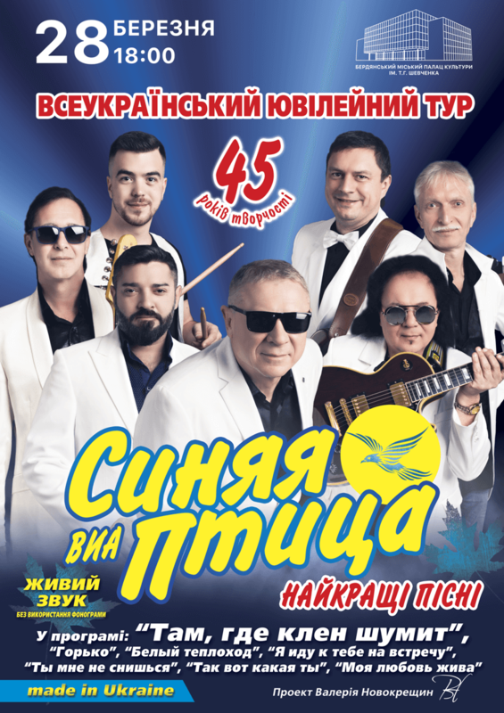 Юбилейный концерт лучших песен ВИА «Синяя Птица» (made in Ukraine) в рамках Всеукраинского тура «45 лет творчества» в Бердянске состоится 28 марта 2020 г, 18:00, Бердянский городской дворец культуры.
